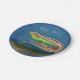 Beautiful, well made, ocean, seaside, fishermen lives inspired aesthetic paper plate for coastal, seaside, lakeside, and tropical homes and businesses, sail boats, yachts, garden parties, featuring watercolor lizard on a branch on watercolor blue and green gradient background and custom text with white letters on the top.