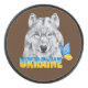 A beautiful way for animal lovers to show their support for Ukraine. Hockey puck design features watercolor grey wolf illustration with "Ukraine" text and butterfly in the blue and yellow colours of their national flag on brown background.