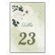 Beautiful botanical table number card featuring romantic white flowers with romantic dark green leaves.