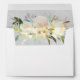 Beautiful, watercolor, white rose floral wedding bouquet at top features vanilla white roses with hints of yellow, pink and peach including some greenery on a silver textured background. Templates for return address on envelope flap.