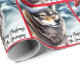This winter scene has a gorgeous wolf wearing a Santa hat in the snow.
