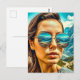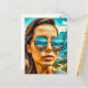 Cool ai art depicting an beautiful lady wearing sunglasses with a reflection of a mountain range. Keeping in touch while travelling postcard.