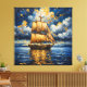 Beautifully rendered sailing ship against a dramatic sky. The ship features large, billowing sails that catch the light, creating a warm, golden hue. The background is filled with rich blues and dark clouds interspersed with vibrant golden highlights, suggesting a sunset or sunrise. The serene water reflects the colours of the sky, enhancing the overall tranquillity of the scene. The texture in the painting gives a sense of movement to the waves and the sails, inviting viewers to imagine the ship sailing through the open waters.