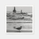 A Seagull rests on the beach as angry waves from Lake Michigan crash around St Joseph North Pier Inner and Outer Lighthouses.