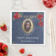 These custom napkins feature a Beauty and the Beast fairy tale theme on a rustic, blue parchment paper design. A vintage style mirror frame is placed in the centre with a sample photo. You can personalise the invitation with your own custom photo or image. The classic Beauty and the Beast fairytale phrase, "Be our Guest" is printed in a mediaeval style gold font above the mirror. Red roses accent the corners.