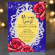 This elegant custom party invitation features a Beauty and the Beast fairytale theme on a blue coloured background. The classic Beauty and the Beast fairy tale phrase, "Be our Guest" is printed above the event information, inside a silver glitter mirror with a yellow background. Two stained glass red roses appear in the bottom left, with a single rose in the top right. Glitter diamonds accent the top and bottom portions.