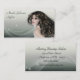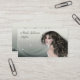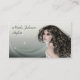Business card with beautiful woman with long, curly hair wearing beautiful makeup. Abstract green gradient background, front and back. Perfect for hair salons, make-up artists, cosmeticians or fashion.