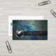 This dark themed beauty salon business card features a chrome icon of a hair style enclosed within a chrome circle over a dark background of a colourful kaleidoscope of abstract shapes. Your business name and text/tagline appear within a black text panel strip that runs from the icon from the left towards the right edge of the card. Your contact details appear on the lower left on the back of the card. Perfect for beauty, fashion, style, trendy, artistic, designer, professional, impact, dark themes.