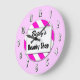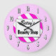 A unique wall clock reading Beauty Shop in block letters with room for your name in retro script on a pink and white striped background surrounded by white and black letters on pink.
