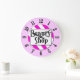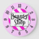 A unique wall clock reading Beauty Shop in retro letters on a pink and white striped background surrounded by black numbers on a pink face. Click Customise It to change background colours and more, even save your design for later.