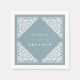 Designed to match our Beaux Arts wedding collection in Tourmaline, these elegant art deco cocktail napkins feature your names on a dusty slate blue background adorned with lacy white papel picado cutout style embellishments at the corners.
