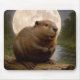 A beaver sits on a log by the river, illuminated by a full moon glowing brightly behind it, with lush foliage surrounding the scene