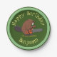 This happy beaver is ready to build his lodge with a chainsaw. Drawn in fun cartoon illustration style for a party!
