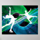 The sports action and energy of figure skating athletes are captured in silhouettes of action figures demonstrating stunts and tricks on the ice. Digital paintings and illustrations of these athletes include backgrounds of bright, vivid colors and splashes and bursts of light to highlight the action..