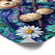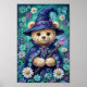 A small bear, tender as a bedtime spell, sits at the heart of a meadow made of midnight and bloom. Round-eyed and gentle, it wears a deep blue wizard’s hat and cloak, both scattered with stars and jeweled with violet light, as if the sky itself had been sewn into fabric. A crystal pendant rests at its chest, glowing softly like a captured moonbeam. Around it, flowers gather in a bright, breathing circle—white petals, purple petals, yellow hearts—each blossom painted with the hush of spring rain and the joy of morning. The bear’s fur is warm honey and cream, soft enough to feel with the eyes alone, a quiet lantern in the garden’s cool glow. one tiny paw, a crystal wand catches the light, a little shard of magic held with the seriousness of a dream. The whole scene feels enchanted and intimate, as though the night has leaned close to listen, and the flowers have opened only to witness the gentle power of this plush little guardian.