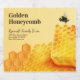 Honeycomb, cut comb, or comb honey container labels designed to cover the top of standard 4 inch clear plastic boxes for honey including the wax honeycomb. Featuring a honey bee flying over golden honeycombs and a dark amber hexagon grid, with personalised text for the name of the beekeeper, type of honey, and net weight.