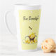 This large latte mug features a design made up of a basket of lemons with a little bee, over a yellow background. On the front and back of the mug are the words "Bee Beautiful!"