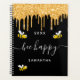 Decorated with happy, smiling yellow and black bumble bees. A chic black background and faux gold glitter drips, paint dripping look. White hand lettered script with swashes and the text: Bee Happy. Personalise and add your name and a year. Perfect for school, work or organising your personal/family life.