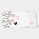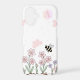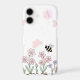 A cheerful scene of a striped bumblebee hovering over vibrant hand-drawn flowers with fresh green leaves and earthy ground.