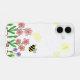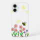 A cheerful scene of a striped bumblebee hovering over vibrant hand-drawn flowers with fresh green leaves and earthy ground.