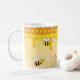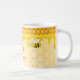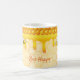 Add some fun and humour to your summer home or work space! Yellow, white background with a honeycomb pattern and happy smiling bees. Decorated with dripping honey. Golden text: Bee Happy