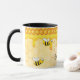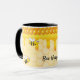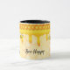 Add some fun and humor to your summer home or work space! Yellow, white background with a honeycomb pattern and happy smiling bees. Decorated with dripping honey. Black colored text: Bee Happy