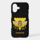 Honey bee with open wings icon over bee hive and honey drops. Custom background colour. Custom text.