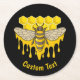 Honey bee with open wings icon over bee hive and honey drops. Custom background colour. Custom text.