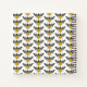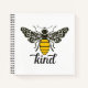 This notebook design features an ornate bee on the front with the work "kind" written below in a script font. The bee design is black and yellow on a bright white background. The back of the notebook has a repeating bee design.