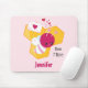 A mousepad with an adorable drawing of a pink and white striped bumble bee. A piece of yellow honeycomb behind. A letter sealed with a heart and a group of floating hearts are also part of the design. Editable text says: Bee Mine.
