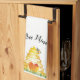 A Valentine's Day kitchen towel decorated with a beehive, bee, and just a touch of gold.