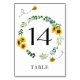 Bee-themed Table number card featuring watercolor wreath with greenery and sunflowers along with buzzing bees. Table number card prints on front and back (double-sided). Items are printed exactly as they appear on your screen when you add to cart, so personalise and add each table number that you need to your cart individually.