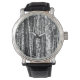Watch in a forest of beech trees, in shades of charcoal grey / grey and white, digitally coloured and enhanced in a chalk and charcoal effect