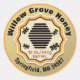 Simple beehive and bees logo in a colourful emblem over a golden striped background with custom text to add your name and the type of honey, beeswax or candles from a backyard beekeeper or professional apiary. Editable text to create square or round stickers for any product, along with contact information and net weight, lot number or harvest date.