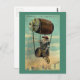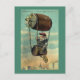A man wearing a captainly cap and sporting a white moustache is flying on a beer stein which is suspended by sausage links from a beer barrel that has a propeller made of beer bottles. The man's watch fob is shaped like a pretzel in this vintage postcard from 1912.