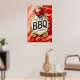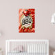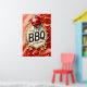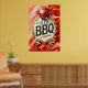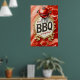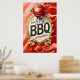 An illustration of a red grill with the words Beer and BBQ go together in a gold frame. The background is a red and white marble design.