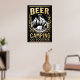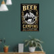 A black and gold illustration depicting a mountain scene with a tent, two beers, and the text Beer And Camping Go Together.