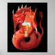 Graphic design of a red dragon drinking beer while doing the heavy metal sign of the horns with his hand.