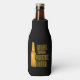 A beer bottle on a funny "Real women drink beer" bottle cooler.