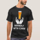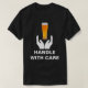 Photo of a glass of beer, image of human hands or palms, text Handle with care. Funny one-of-a-kind t-shirt for men. Customisable. You can change images and you can change or delete the template text. Do not forget to change the gender, style and colour of the t-shirt. Have fun.