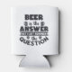 Beer is the Answer but apparently the question is irrelevant because it is forgotten. None the less your beer will be kept cold with this humourous beer cosy.