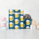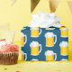 Fun gift wrap featuring a pattern of jugs of beer, on a blue background.