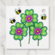 Three cute bumbles bees flying over bright green and pink spring flowers on favour tags.