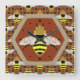 This cute pattern features a graphic motif of busy bees in black and yellow set against a stylised honeycomb design in warm orange and brown hues.