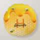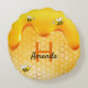 A golden bee honeycomb pattern and happy smiling bumble bees. Decorated with sweet dripping honey. Add your name and monogram letter, orange and black letters. The name is written with a hand lettered style script.