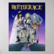 The classic theatrical poster art for Beetlejuice, featuring him sitting atop a house with Barbara and Adam Maitland as the Deetz family approach the house.
