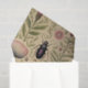A pattern of beetles, green leaves, and pink flowers over a light yellow background.