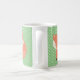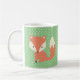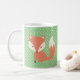 Adorable mug with sleeping fox and awake fox on the other side with a light green polka dot background.