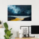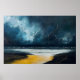This dramatic abstract seascape captures the charged stillness just before a storm breaks. Dark, turbulent clouds roll heavily across the sky, painted in deep shades of navy, slate blue, and charcoal, while fine golden lines crack through the atmosphere like distant lightning. Below, the sea lies restless yet restrained, its pale, reflective surface meeting a glowing strip of golden shoreline that feels both calm and foreboding.