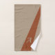 Trendy abstract terracotta brown and beige tan stylish geometric colour block bath towel set personalised with your monogram and name.
